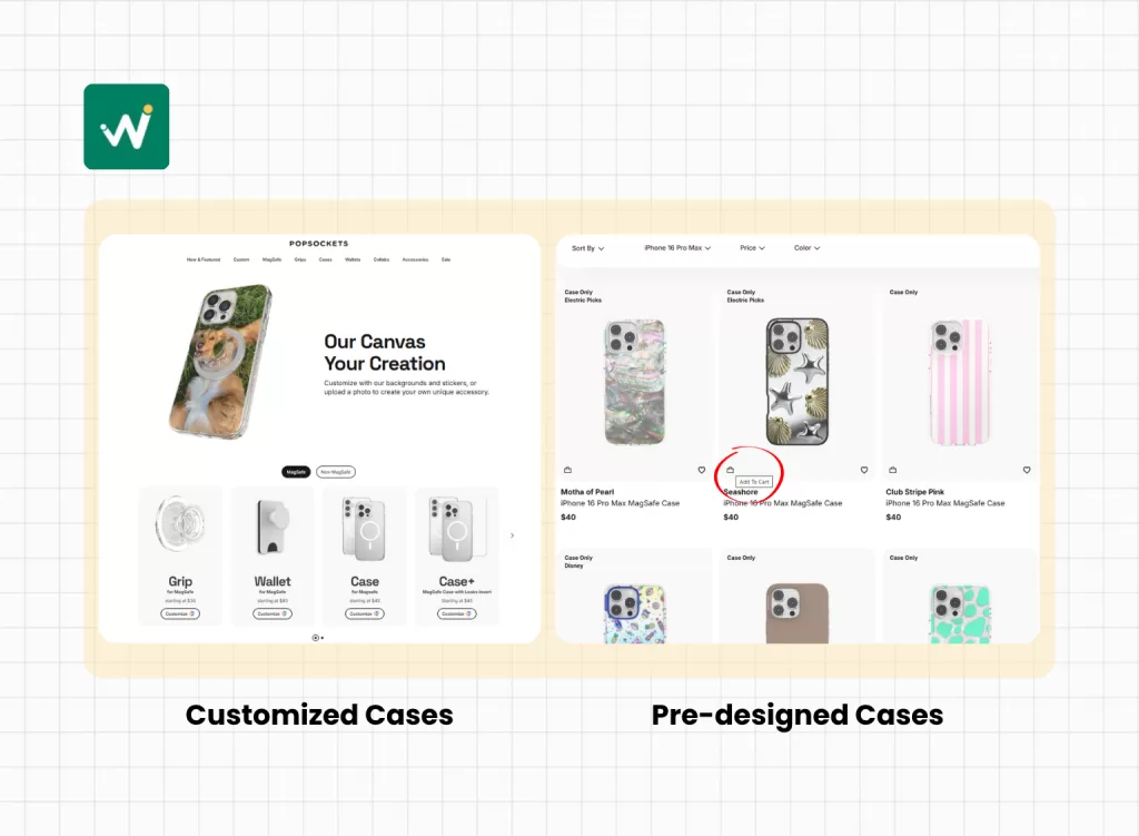 Example: Popsockets’s simple, pre-designed cases performed well with quick add buttons, but their personalized cases (requiring text input and design choices) saw better conversions when customers visited the full product page to see all customization options.